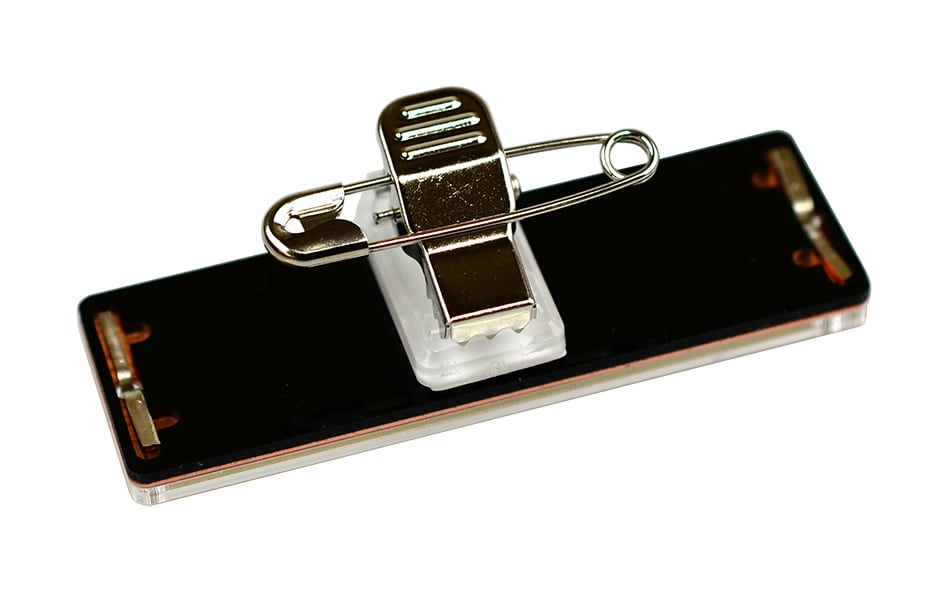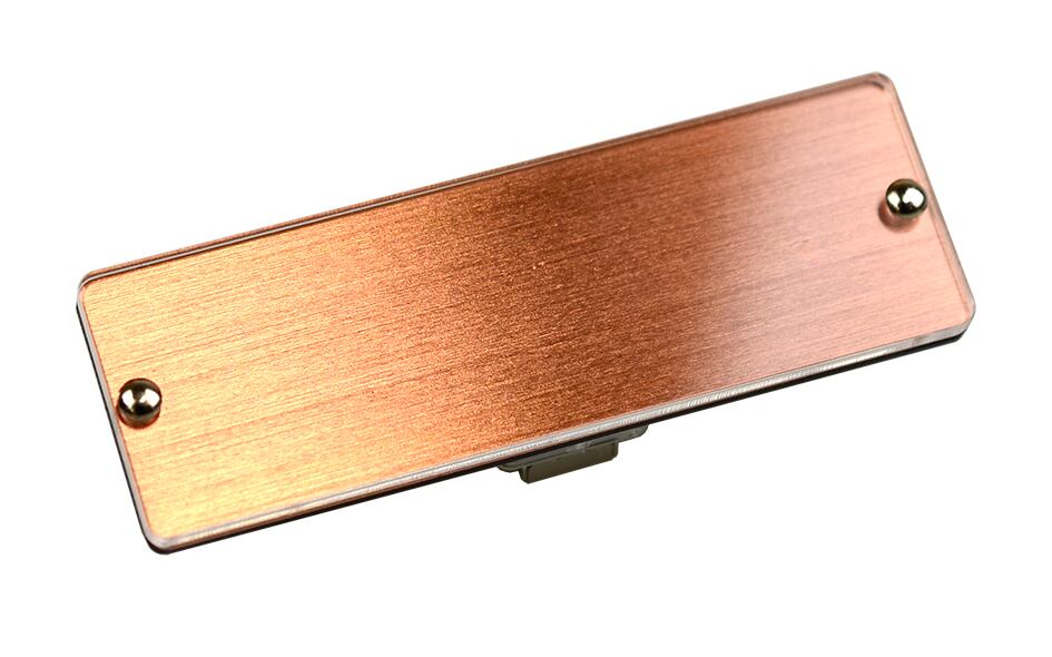 金属の銅の上に透明アクリルを載せた、差し替え可能な名札です。裏面に黒アクリルを貼っています。(実用新案取得商品)