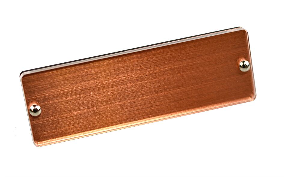 金属の銅の上に透明アクリルを載せた、差し替え可能な名札です。裏面に黒アクリルを貼っています。(実用新案取得商品)