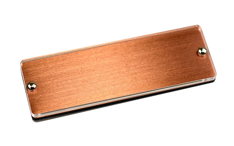 金属の銅の上に透明アクリルを載せた、差し替え可能な名札です。裏面に黒アクリルを貼っています。(実用新案取得商品)