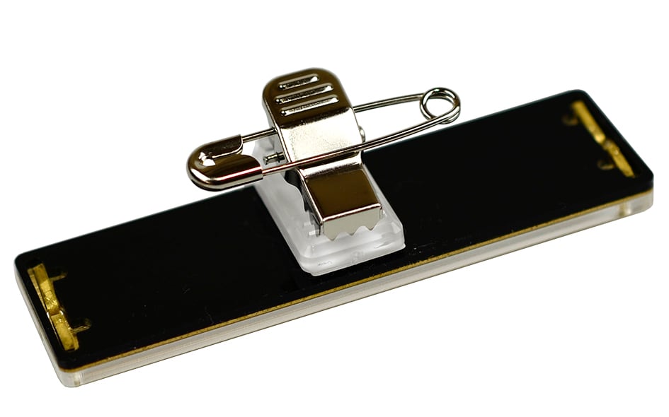 金属の真鍮の上に透明アクリルを載せた、差し替え可能な名札です。裏面に黒アクリルを貼っています。(実用新案取得商品)