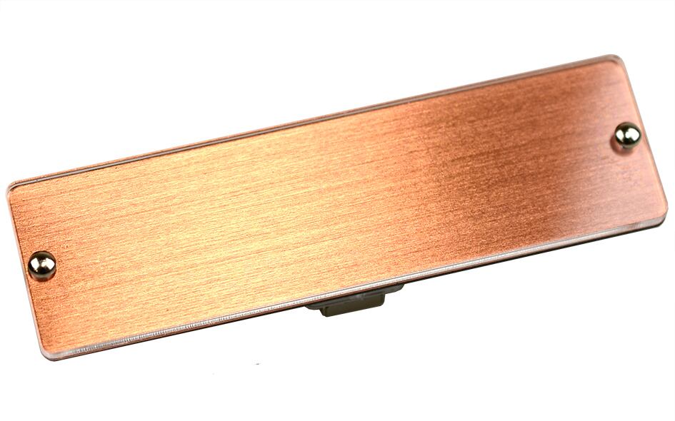 金属の銅の上に透明アクリルを載せた、差し替え可能な名札です。裏面に黒アクリルを貼っています。(実用新案取得商品)
