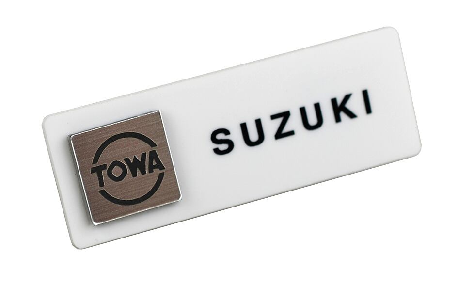 銀ABS×彫刻×色入れにより、オリジナルロゴ入り名札が製作出来ます。